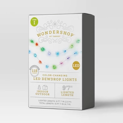 Add a vibrant, welcoming glow to your indoor or outdoor decor with these 115-Count LED High-Density Dewdrop Christmas String Lights from Wondershop™. Featuring a silver plastic wire mounted with multicolor dewdrop LED bulbs that sparkle beautifully with a color-changing effect, these 115-count high-density string lights will illuminate your home for any party or gathering. Wrap them around a banister inside or drape them along a bush outside for a festive glow.
